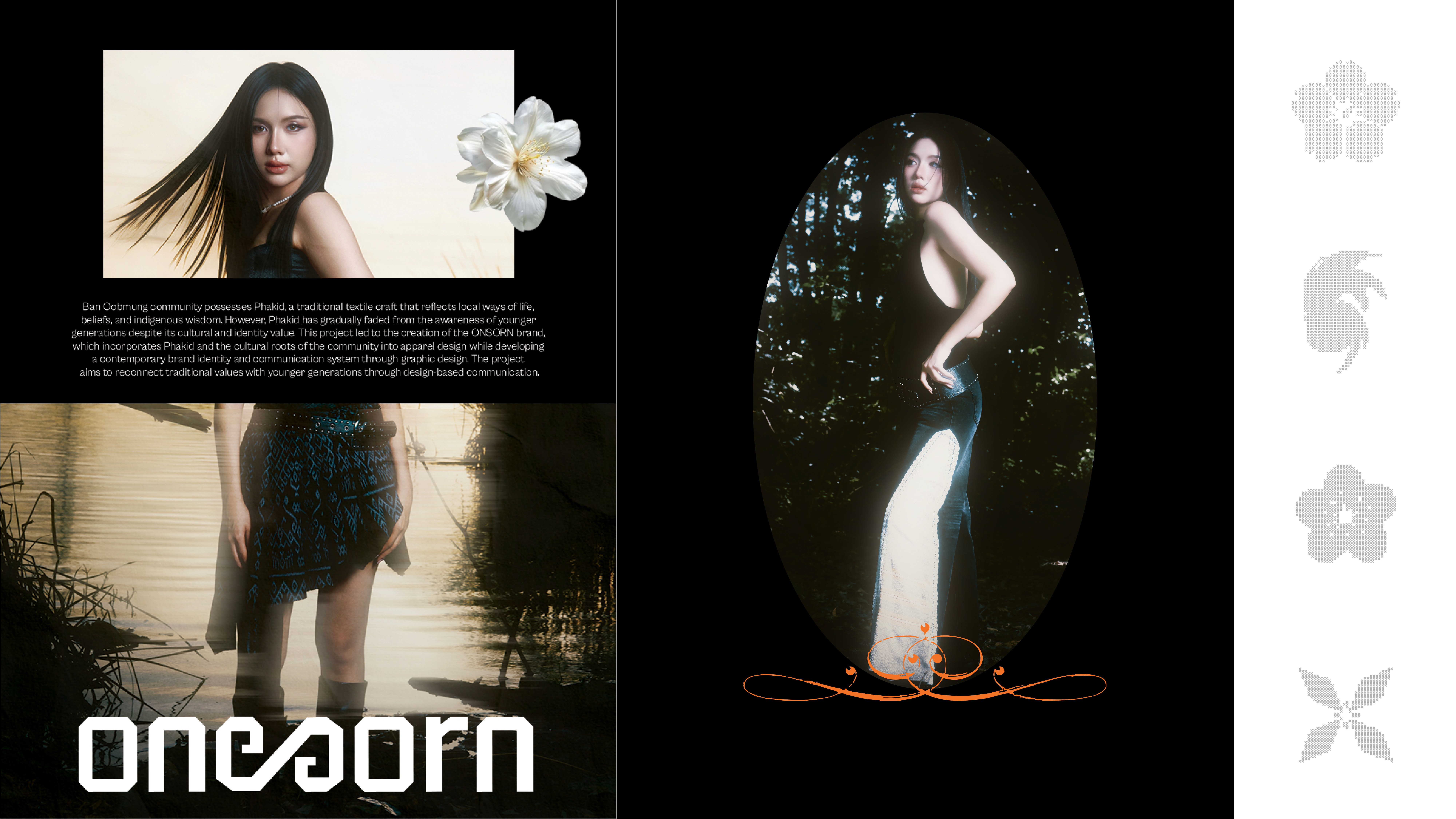 Ban Oobmung community possesses Phakid, a traditional textile craft that reflects local ways of life, beliefs, and indigenous wisdom. However, Phakid has gradually faded from the awareness of younger generations despite its cultural and identity value. This project led to the creation of the ONSORN brand, which incorporates Phakid and the cultural roots of the community into apparel design while developing a contemporary brand identity and communication system through graphic design. The project aims to reconnect traditional values with younger generations through design-based communication.