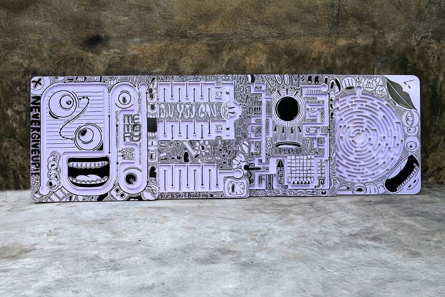 A print media project enhancing muscle memory for gamers via "Synaptic Flow Progression." This 8-level training innovation merges neuroscience with Doodle art to overcome skill plateaus. By stimulating new neural pathways through systematic repetition, it syncs brain and muscle motor output. The high-contrast black-and-white design uses intricate patterns as "visual noise" to train focus and concentration, transforming repetitive practice into a tangible and functional aesthetic.