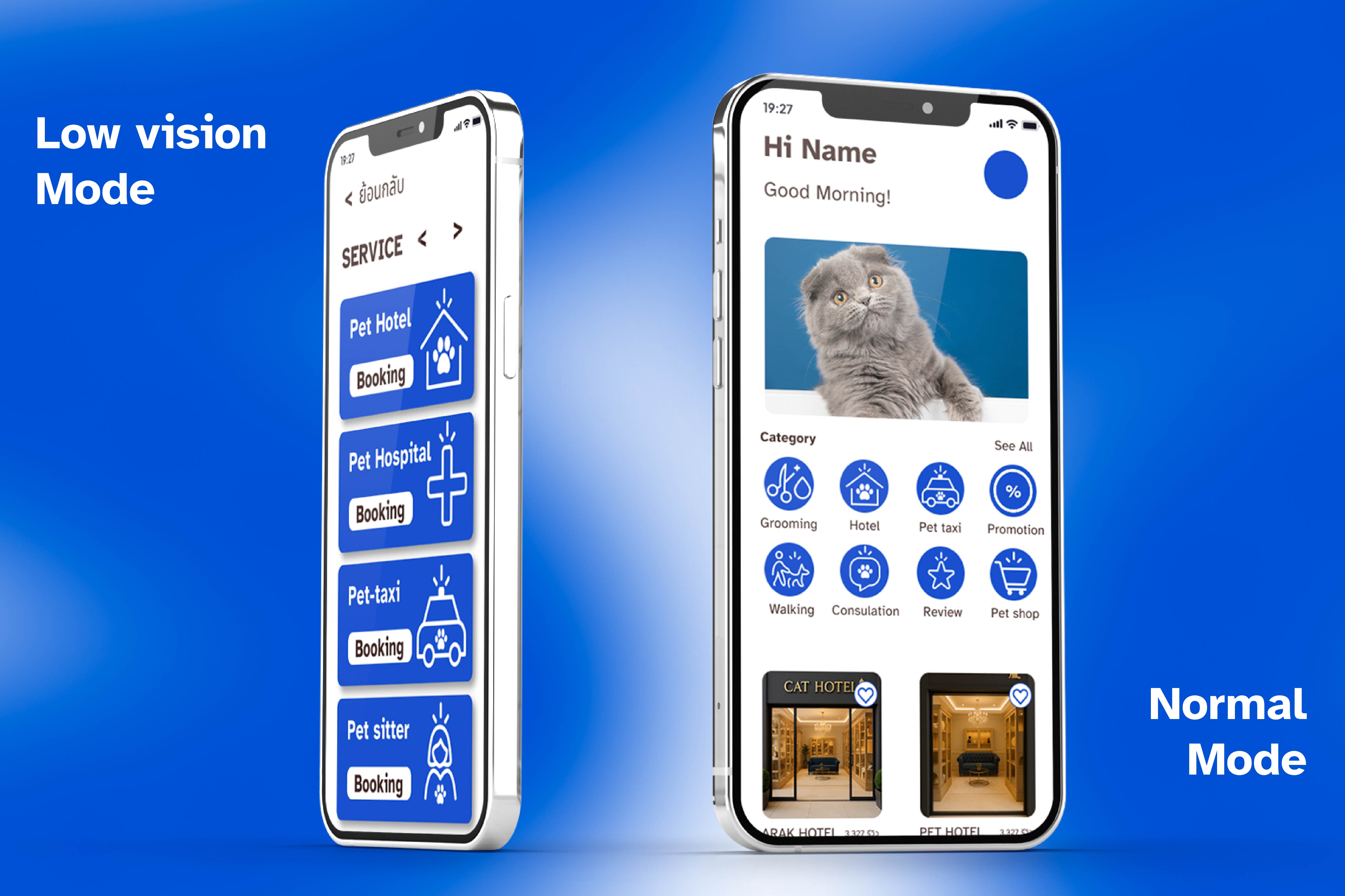 โครงการออกแบบ แอปพลิเคชันที่ออกแบบมาให้คนตาบอดเลือนรางสามารถใช้งานได้ โดยภายในแอปจะมี สองโหมด ได้แก่ โหมดปกติ และ โหมดสำหรับคนตาบอดเลือนราง แอปพลิเคชันนี้เป็นแอปสำหรับจองบริการต่าง ๆ ที่เกี่ยวข้องกับสัตว์เลี้ยง เช่น การจองโรงแรมแมว การจองโรงพยาบาลสัตว์ ร้านค้าสำหรับสัตว์เลี้ยง รวมถึงมีระบบเรียกรถ และบริการอื่น ๆ ที่เกี่ยวข้อง